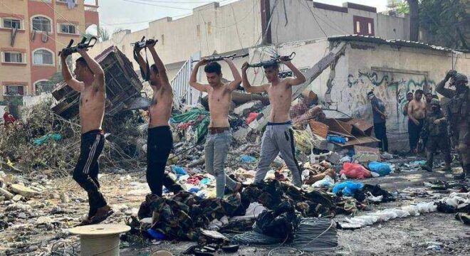 Uma foto divulgada pelo Exército mostra homens sem camisa andando com rifle levantado sobre a cabeça.