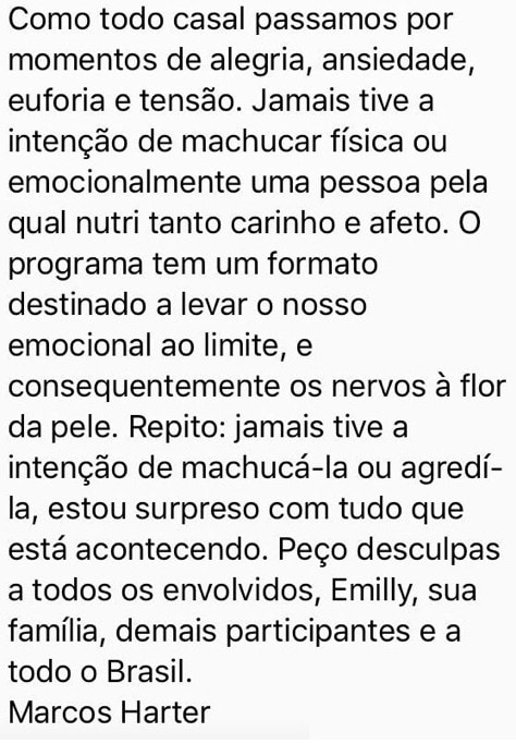 “Jamais tive a intenção de machucar física ou emocionalmente uma pessoa pela qual nutri tanto carinho e afeto. O programa tem um formato destinado a levar o nosso emocional ao limite e, consequentemente, os nervos à flor da pele”, explicou Marcos no comunicado.
