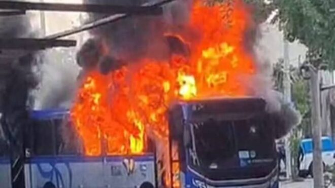 Reprodução - 2/05/2023 Ônibus é incendiado no Morro da Primavera, região da Zona Norte da capital fluminense