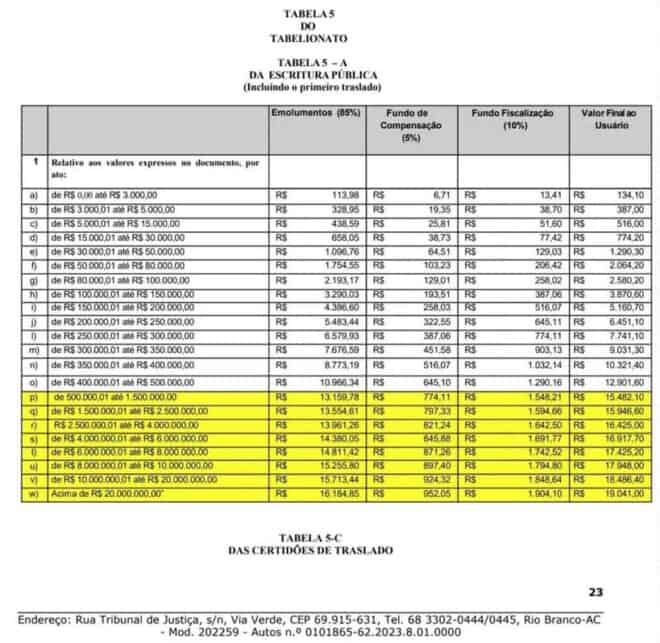 A principal mudança, de acordo com o TJ, foi a criação de novas faixas de cobrança que chegam até R$ 20 milhões, aplicando alíquotas decrescentes conforme o valor da transação. Até então, o teto máximo considerado nas tabelas do Acre era de apenas R$ 500 mil, “patamar muito abaixo da realidade atual do mercado imobiliário”, segundo o documento.