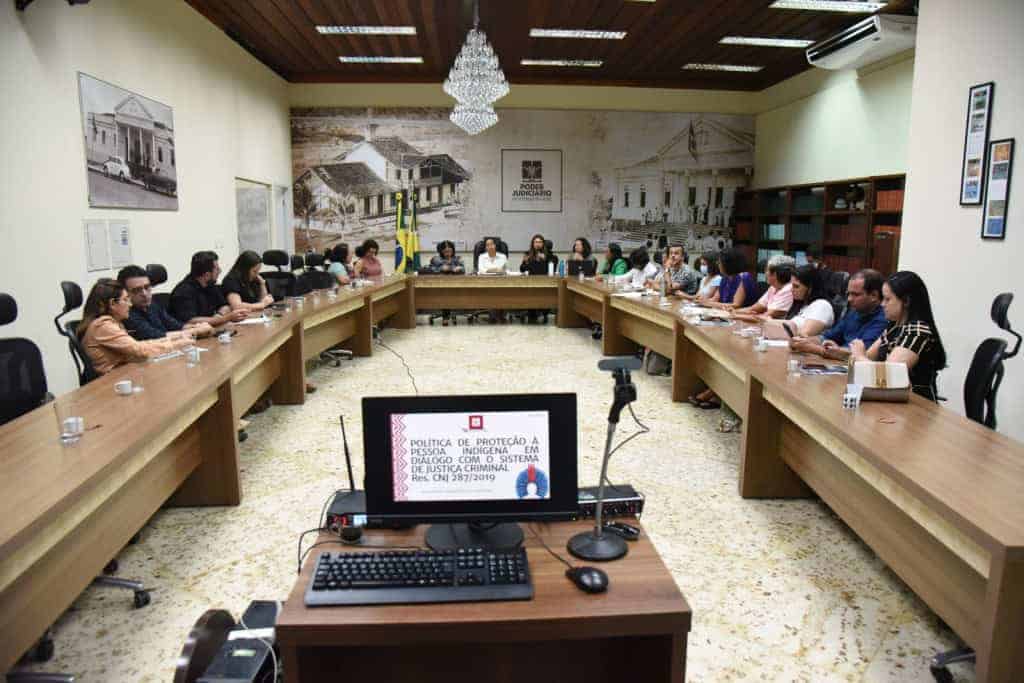 Ainda no mês que comemora-se o dia dos Povos Indígenas, o Tribunal de Justiça do Acre (TJAC), por meio do Grupo de Monitoramento e Fiscalização do Sistema Carcerário (GMF), realizou o primeiro encontro do Grupo de Trabalho 6 (GT6), de Proteção à Pessoa Indígena em Diálogo com o Sistema de Justiça Criminal, que ocorreu nesta segunda-feira, 29, no Palácio de Justiça.