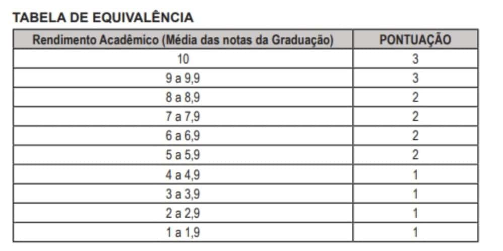 O processo seletivo simplificado será realizado em etapa única, por meio de análise curricular, de caráter classificatório e eliminatório. As candidatas e os candidatos serão ranqueados em ordem decrescente, conforme o coeficiente de rendimento acadêmico (CRA), que deverá ser superior a dois, levando-se em consideração a seguinte tabela de pontuação: