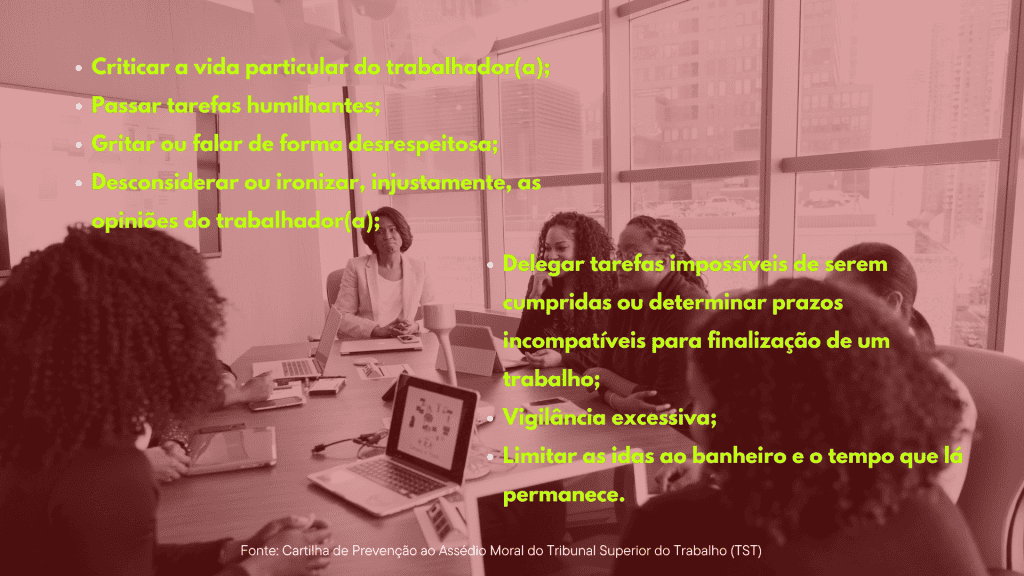 O assédio moral é caracterizado por condutas que atacam a integridade e dignidade humana da trabalhadora ou trabalhador, ou seja, são práticas que degradam as relações no ambiente de trabalho, por meio de diferentes desrespeitos. Veja exemplos: