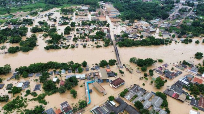 Vista de Brasiléia alagada nesta segunda-feira, dia 26 – Foto: Vinicius Ferrari/cedida – PROATEC- Projetos e Assessoria técnica rural