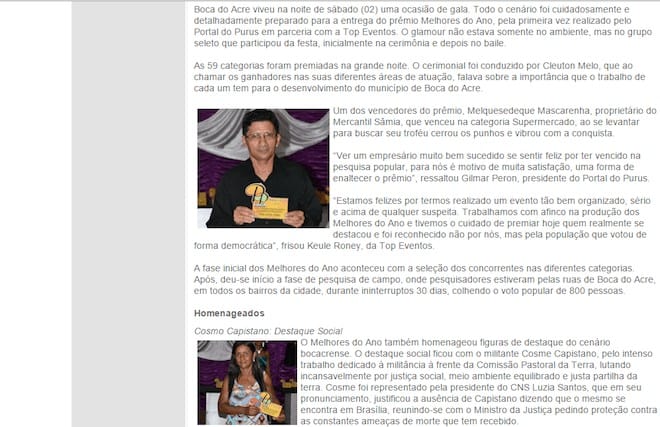 A equipe organizadora, parte integrante da TOP EVENTOS, no intuito de reconhecer verdadeiramente quem são os melhores nas diversas áreas de atuação, tendo a satisfação de comunicar que no dia 20 de dezembro de 2014 será realizada a premiação de gala dos MELHORES DO ANO DE BRASILÉIA E EPITACIOLÂNDIA EM 2014.