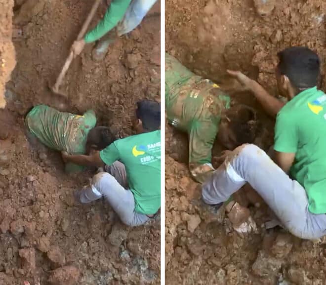 Um vídeo feito por pessoas que estavam no local mostra o momento em que o homem, em estado de desespero, pede socorro e se queixa de dores na coluna, enquanto colegas de trabalho removem o barro para libertá-lo.