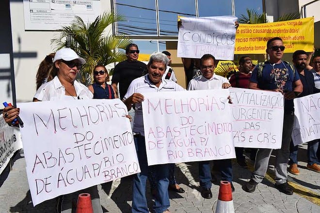 Dezenas de trabalhadores do Serviço de Água e Esgoto de Rio Branco (Saerb) ocuparam a sede do Departamento Estadual de Pavimentação e Saneamento (Depasa) na terça-feira, 11, em manifesto para cobrar melhorias nas condições de trabalho dos profissionais e reajustes da data-base e do vale alimentação, além de outras pautas. Organizado pelo Sindicato dos Urbanitários, o ato foi feito para pressionar o diretor do órgão, Zenil Chaves, para abertura de diálogo entre servidores e Direção.