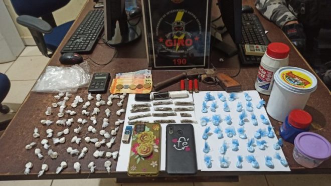 Os policiais militares receberam uma denúncia via COPOM que na região do loteamento Vila Maria haviam homens vendendo entorpecentes. Os policiais se deslocaram até a região, visualizaram os dois homens e uma mulher vendendo as drogas, foi feito a abordagem e em posse do trio foram encontrados 12 tabletes maconha, 34 trouxinhas de cocaína, 54 trouxinhas de pasta a base de cocaína, uma escopeta com três munições calibre 36, dois celulares, material para embalo dos entorpecentes e uma quantia de R$ 59,90 oriundo das vendas das drogas.