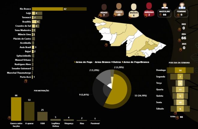 O comparativo com 2024 mostra que, naquele ano, o Acre contabilizou 156 homicídios, sendo 66 ligados a disputas entre facções criminosas. Na ocasião, todas as vítimas desse tipo de crime eram homens, o que evidencia a predominância masculina nesse recorte da violência.