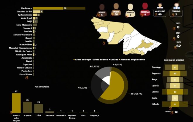 Entre as vítimas de homicídios relacionados a conflitos de facção em 2025, 60 eram homens e duas mulheres. A capital Rio Branco concentrou a maior parte desses crimes, com 38 casos. No interior, Cruzeiro do Sul apareceu em seguida, com nove registros, enquanto Epitaciolândia contabilizou cinco casos. Outros municípios como Mâncio Lima, com dois homicídios, além de registros isolados em Feijó, Brasiléia, Tarauacá, Marechal Thaumaturgo e Rodrigues Alves, demonstram a dispersão territorial da violência ligada a esses confrontos.