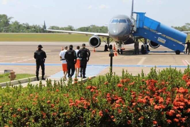 Detentos sendo levados pela Polícia até o avião. Fotos: Ascom/Iapen