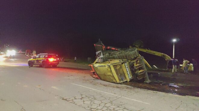 Um trator de esteira caiu de uma carreta prancha e deixou a BR-364 parcialmente interditada na noite desta quarta-feira (12), na Via Verde, nas proximidades da 3ª Ponte, em Rio Branco.