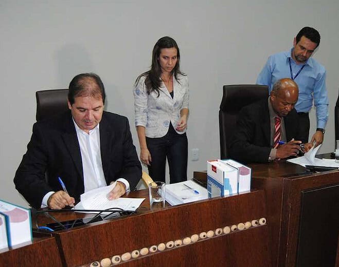 O presidente do Tribunal Regional Eleitoral do Acre em exercício, desembargador Samoel Evangelista, e o governador do Estado do Acre, Tião Viana, assinaram na tarde desta terça-feira, 28, termo de cooperação técnica no intuito de realizar intercâmbio de dados biométricos da população coletados pela Secretaria de Segurança Pública do Estado, durante emissão de identidade.