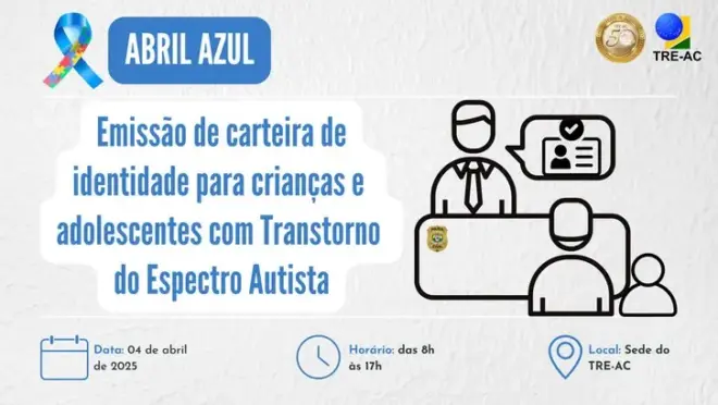 Como parte da programação especial do Projeto Abril Azul, e em mais uma ação dos 50 anos do Tribunal Regional Eleitoral do Acre (TRE-AC), será realizada, no dia 4 de abril, uma iniciativa voltada à inclusão e à cidadania de pessoas com Transtorno do Espectro Autista (TEA).