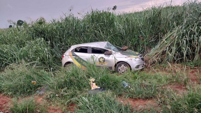 Um carro modelo Chevrolet/Onix, de cor prata, de uma empresa de proteção veicular, teria capotado por algumas vezes ao acessar o trecho que vem recebendo manutenção pelo DNIT.