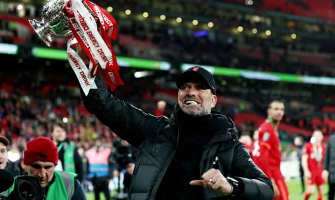 O Liverpool, que venceu a Copa da Liga em fevereiro, continua com chances de uma inédita conquista quadrupla nesta temporada.