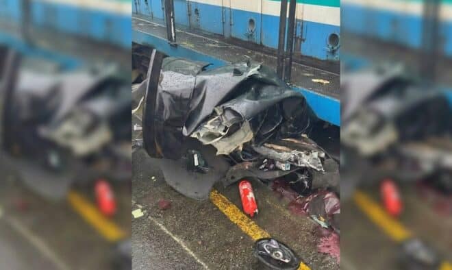 O veículo chegou a ser arrastado por alguns metros e ficou preso na linha férrea. Imagens que circulam nas redes sociais mostram o estado em que o carro ficou: