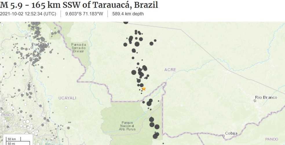 Um terremoto de magnitude 5,9 foi registrado na manhã deste sábado, 02, a 165 quilômetros (km) de Tarauacá, no Acre, e detectado pelo Serviço Geológico dos Estados Unidos (USGS, na sigla em inglês). O tremor teve uma profundidade de 589,4 km, informou o órgão.
