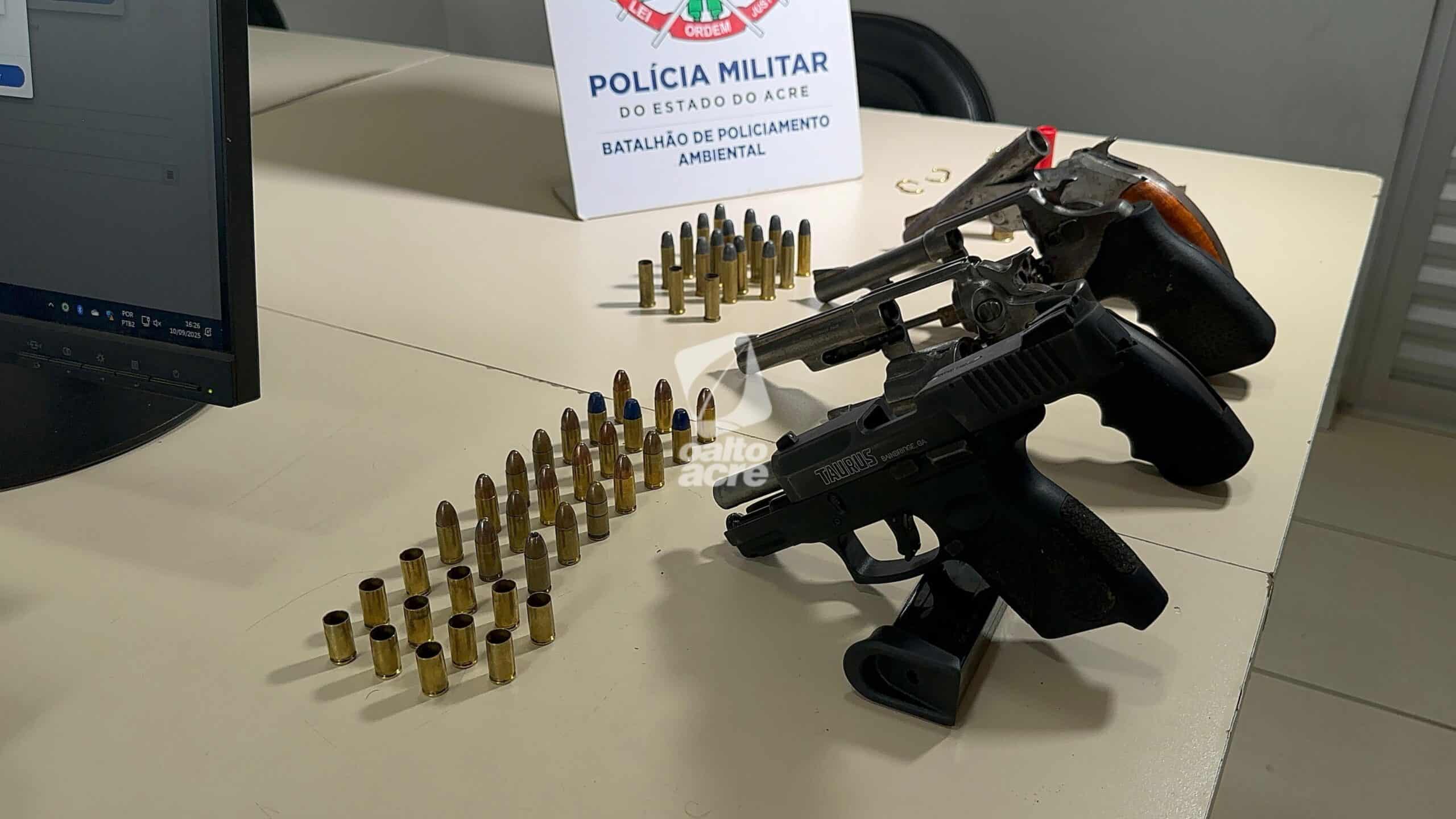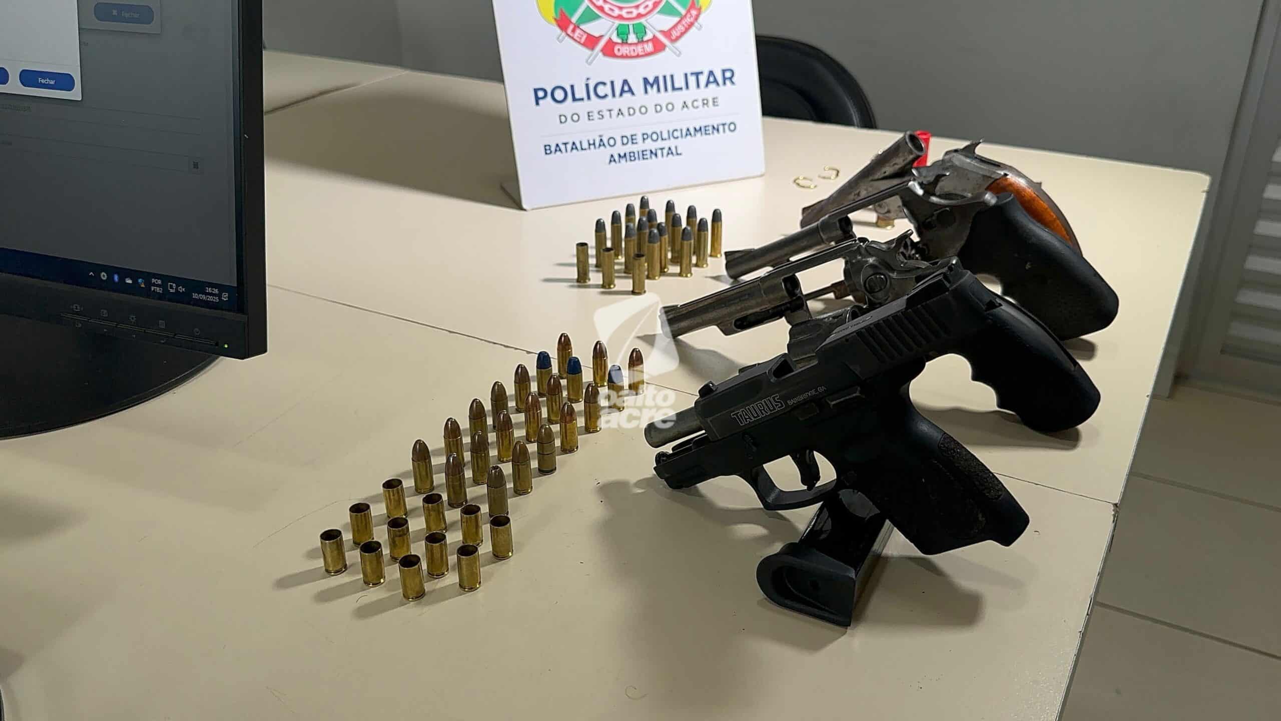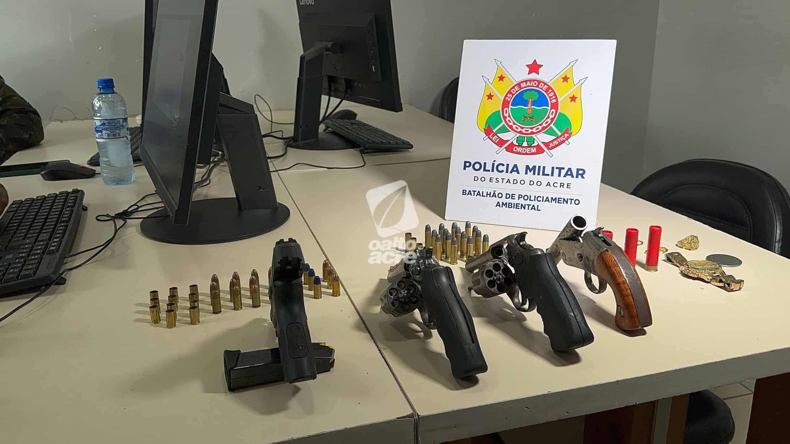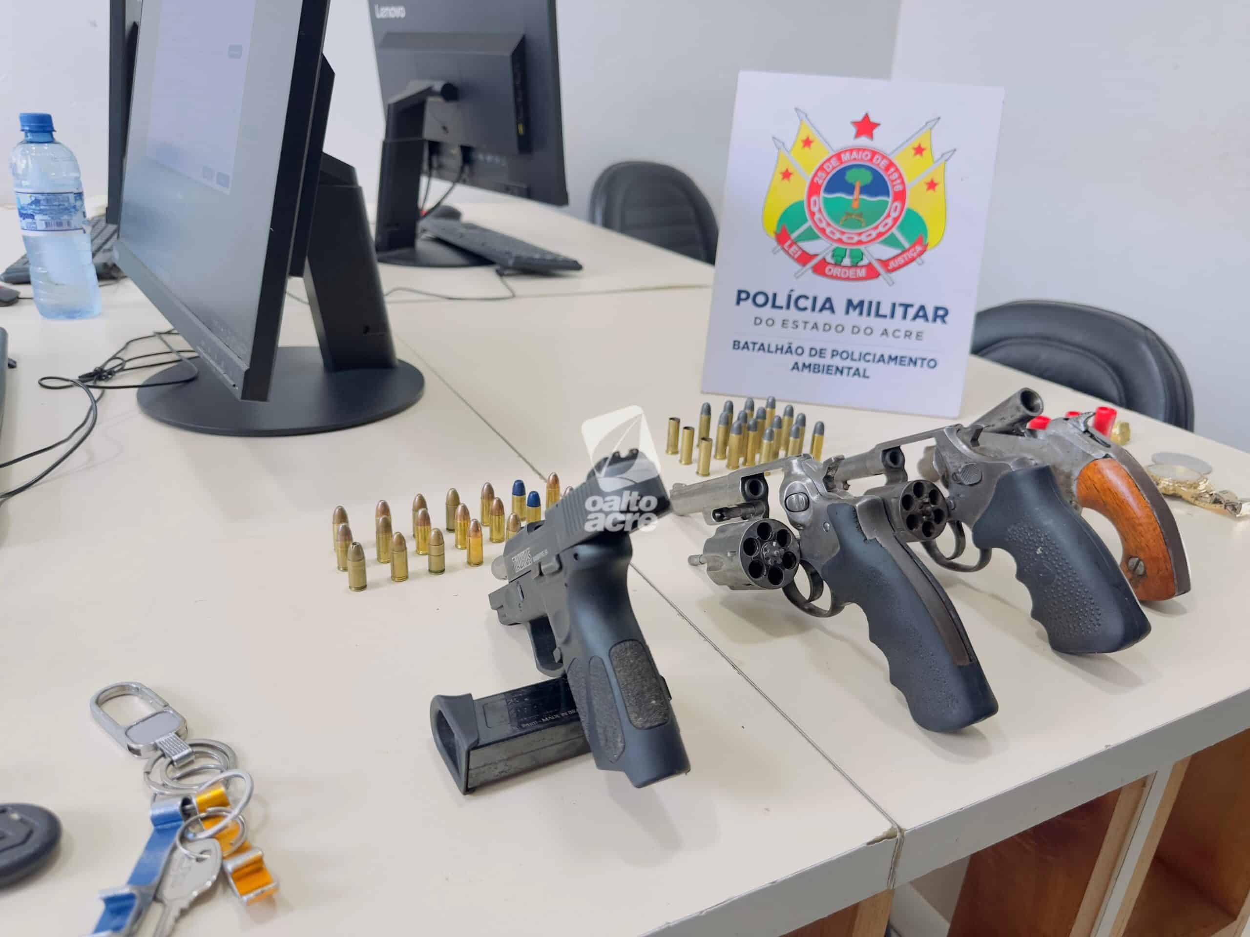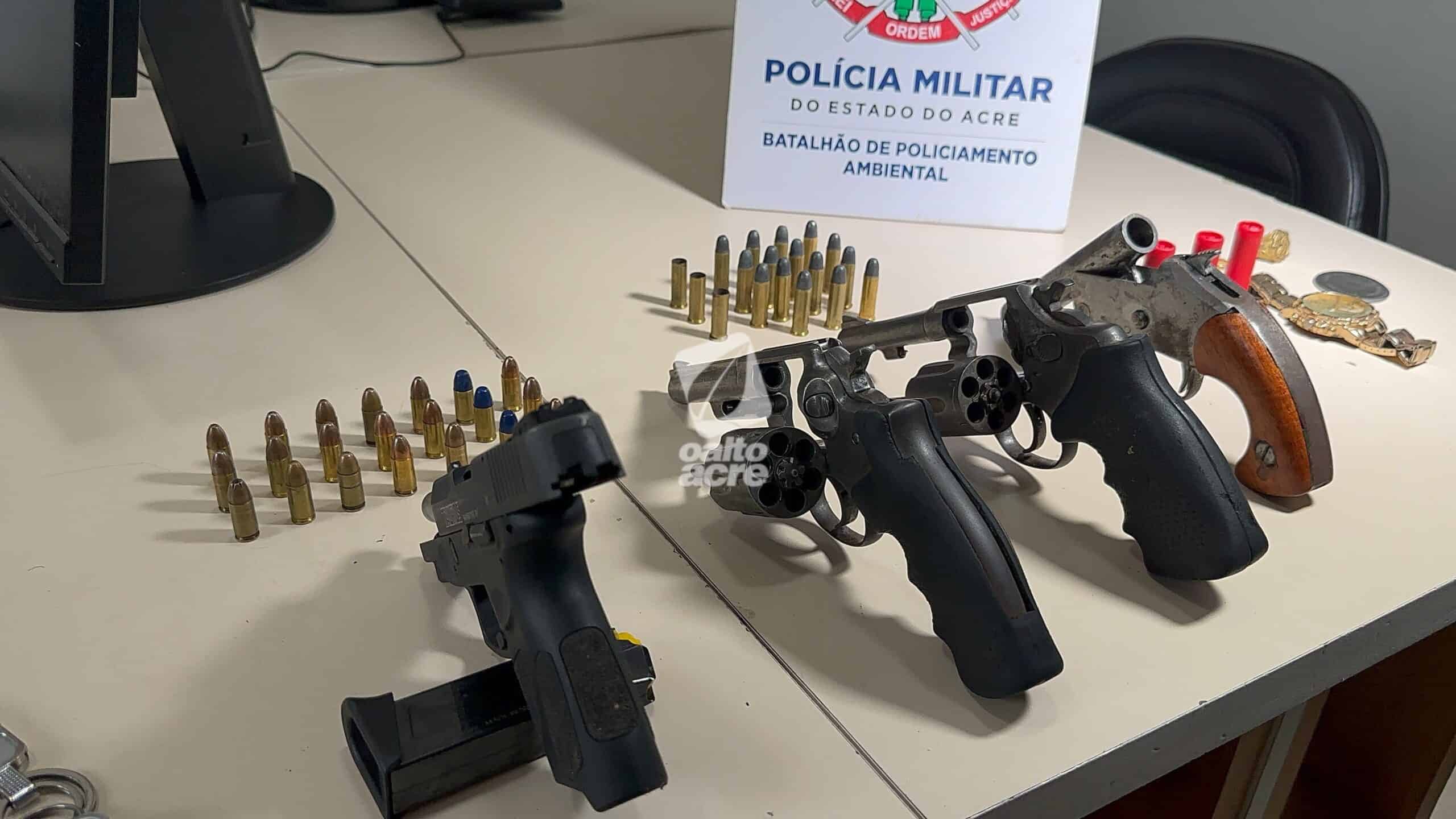 Com eles, foram encontradas uma pistola calibre 9mm, dois revólveres calibre 38, uma garrucha, além de 39 munições intactas e 13 deflagradas.