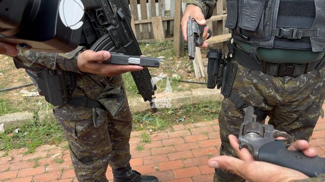 Com eles, foram encontradas uma pistola calibre 9mm, dois revólveres calibre 38, uma garrucha, além de 39 munições intactas e 13 deflagradas.