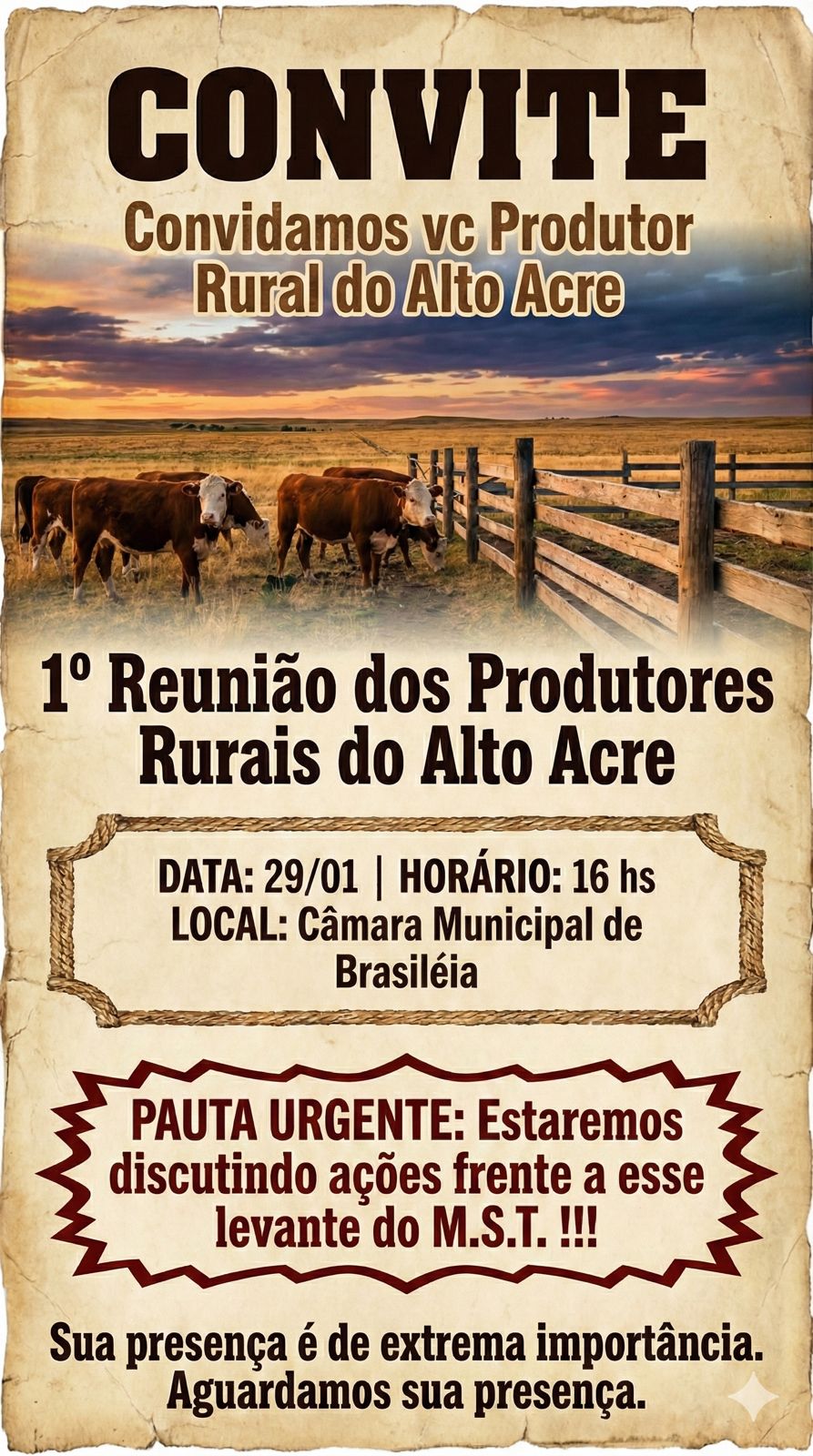 A mobilização ganhou força após a circulação de um card em grupos de WhatsApp e outras redes sociais convocando a possível reunião. O alerta ocorreu depois da confirmação da criação de uma frente do MST no km 29 da BR-317, a Estrada do Pacífico, em uma propriedade pertencente ao ex-vereador do Partido dos Trabalhadores (PT), Rosildo Rodrigues.