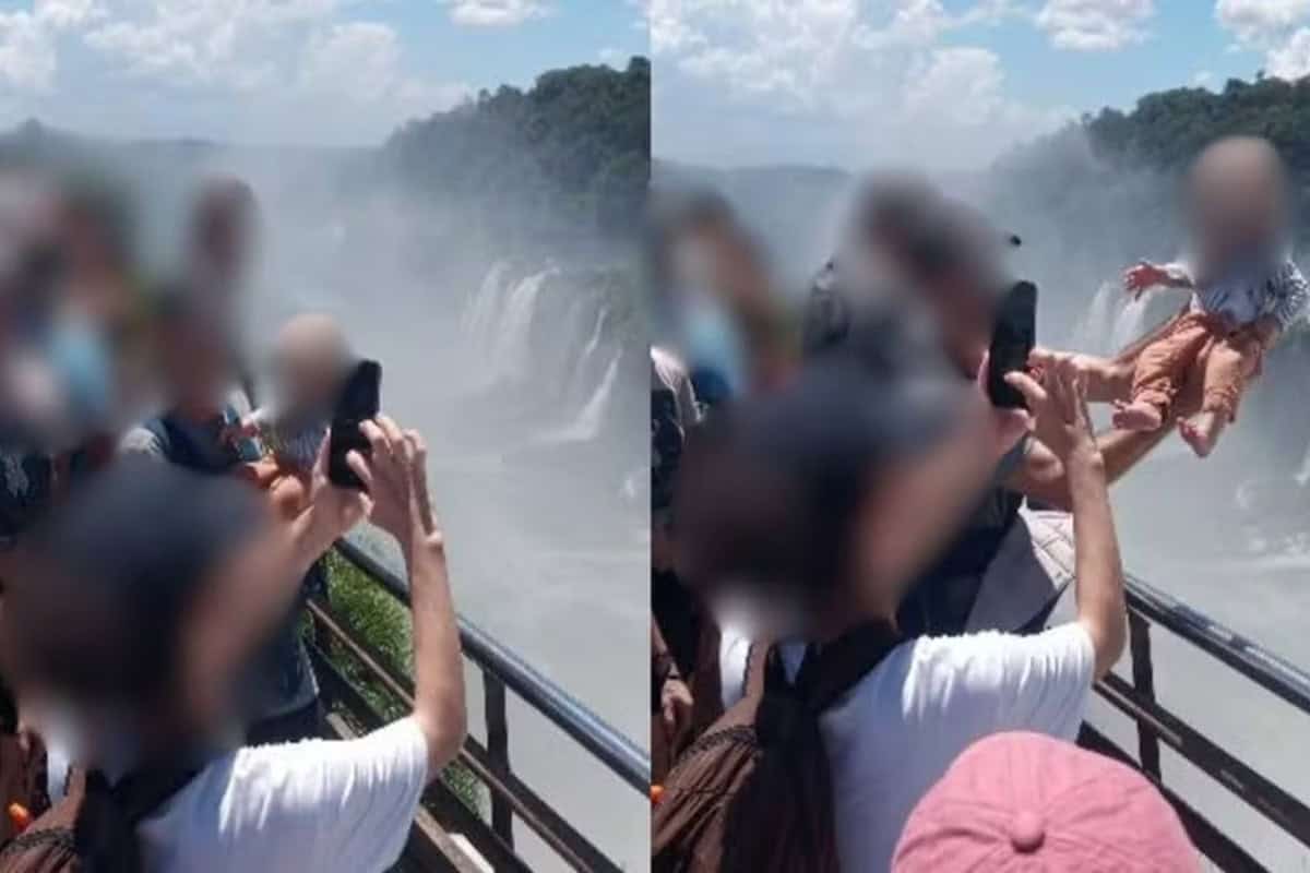 Um homem foi flagrado segurando um bebê por cima das grades de proteção no mirante da Garganta do Diabo, com vista para as Cataratas do Iguaçu, em uma área com cerca de 80 metros de altura. A atitude perigosa foi registrada por visitantes e repercutiu nas redes sociais.