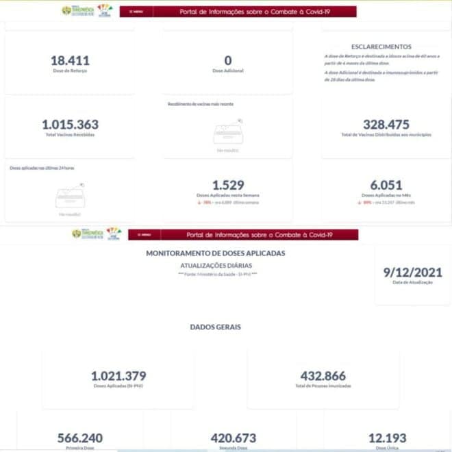 De acordo com informações do portal de transparência do governo, o Acre já recebeu 1.015.363 doses de vacinas e foram aplicadas 1.021.379 doses na população até o dia 9 de dezembro, data da última atualização. Das doses, 566.240 pessoas tomaram a primeira dose, 420.673 a segunda, 12.193 a dose única e 18.411 a de reforço.