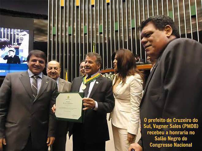 O prefeito de Cruzeiro do Sul, Vagner Sales (PMDB) foi homenageado na manhã desta quarta-feira (4), na Câmara Federal, em Brasília, com a Medalha do Mérito Legislativo, honraria concedida todos os anos às autoridades, instituições e personalidades que tenham prestado serviços relevantes ao país. Sales foi um dos indicados pelos membros da Mesa Diretora e por iniciativa dos líderes partidários no Congresso Nacional.