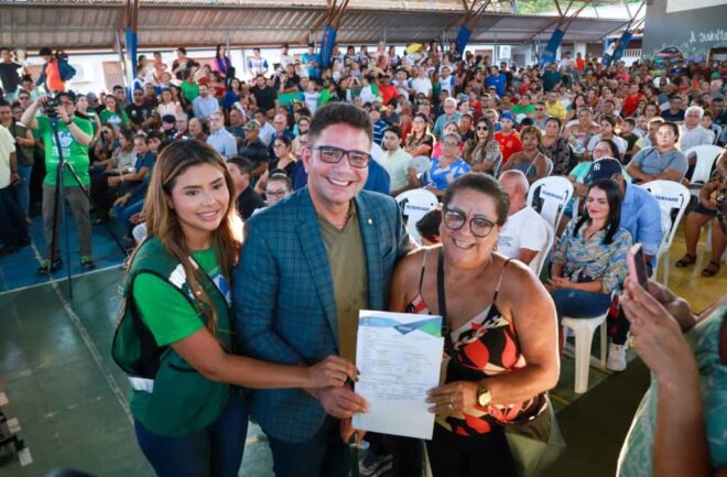 A quadra da Escola Doutor Mário de Oliveira, em Rio Branco, foi palco na tarde desta sexta-feira, 5, de uma cerimônia marcante para centenas de famílias acreanas. O governador Gladson Cameli, acompanhado por Gabriela Câmara, presidente do Instituto de Terras do Acre (Iteracre), conduziu a entrega de mais 500 títulos definitivos de propriedade, um passo crucial para a consolidação do direito à terra e à moradia digna, num investimento governo do Acre de R$ 2,6 milhões.