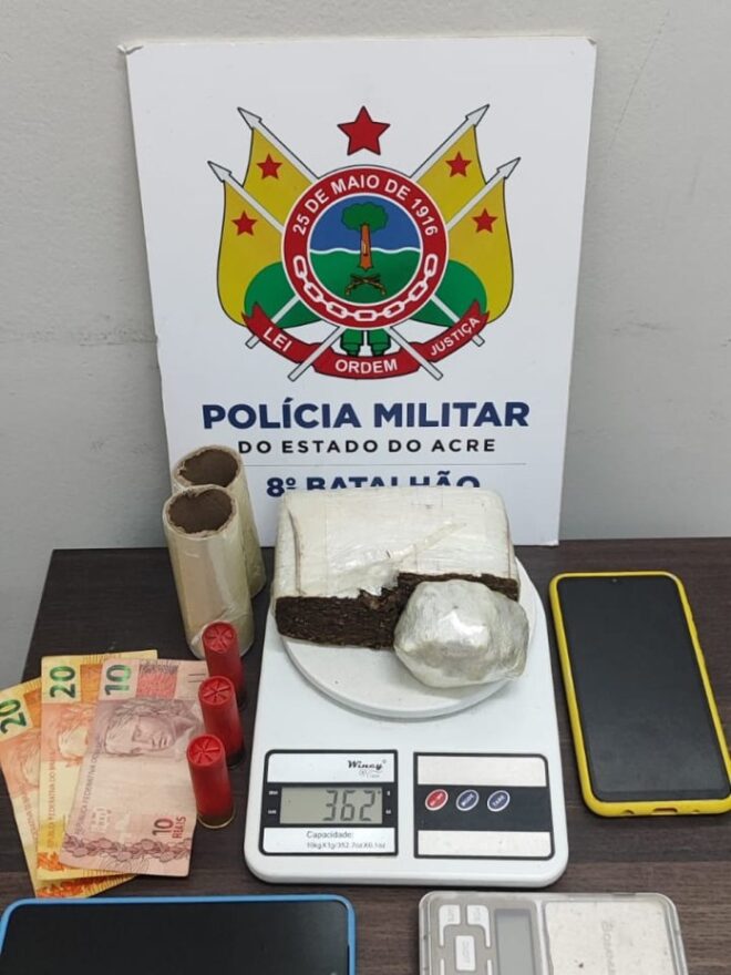 A Polícia Militar, por meio do 8º Batalhão (8º BPM), apreendeu 362 gramas de maconha, três munições calibre 16, dinheiro e materiais usados no tráfico de drogas durante uma ação na noite de terça-feira no bairro Eugênio Augusto Areal, em Sena Madureira. Dois suspeitos foram presos no local.