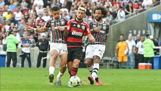 Fluminense e Flamengo empataram sem gols hoje (16), no Maracanã, pela 15ª rodada do Campeonato Brasileiro. O clássico carioca ainda teve dois gols anulados pelo árbitro de vídeo, que também levou à expulsão de Luiz Araújo por falta em Marcelo.