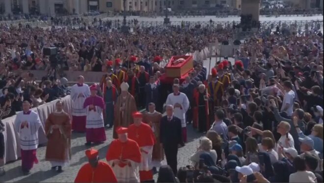 Procissão com caixão do papa Francisco no Vaticano. • ReproduçãO/Reuters
