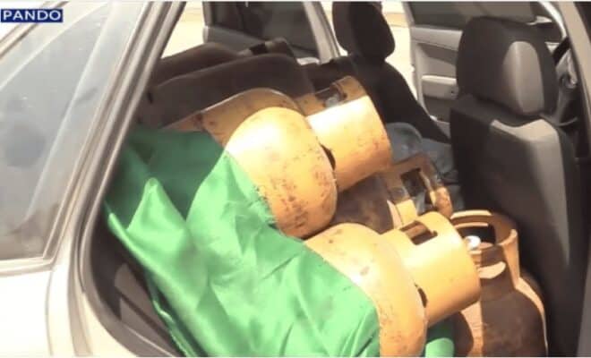 Os agentes encontraram no banco traseiro do veículo uma quantidade significativa de botijões de gás de petróleo liquidificado que e proibido pela lei Boliviana sua comercialização do lado do Brasil. Foto: captada