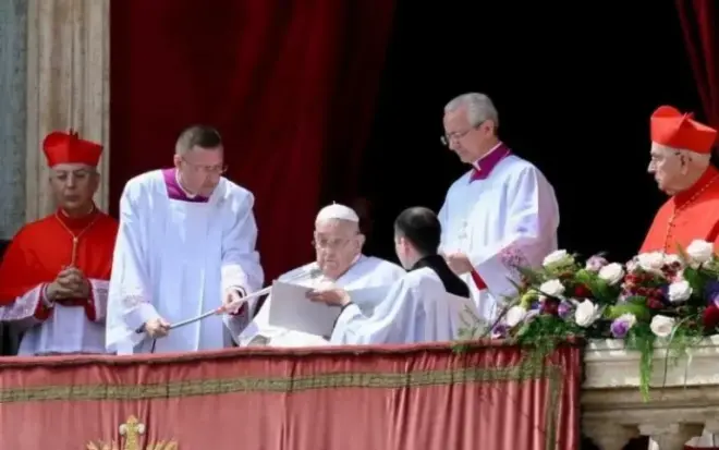 Francisco desejou uma feliz Páscoa para os fiéis presentes e pediu que um assessor lesse a mensagem.