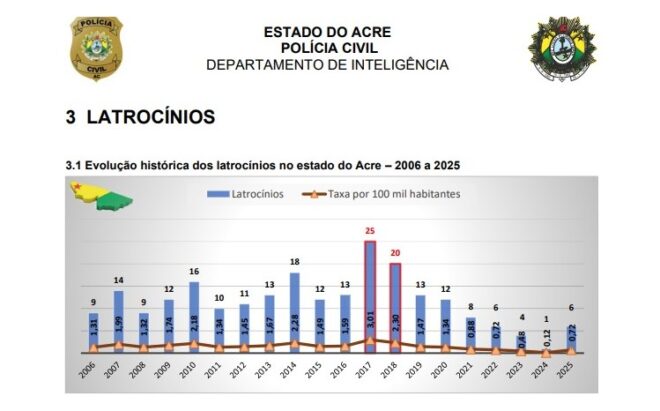 O crime de latrocínio (roubo seguido de morte) registrou queda consistente no Acre entre 2017 e 2025, conforme dados divulgados pela Polícia Civil do estado. O número de casos passou de 25 em 2017 para apenas 6 em 2025, uma redução de 76%. A taxa por 100 mil habitantes caiu de 3,01 para 0,72 no mesmo período.