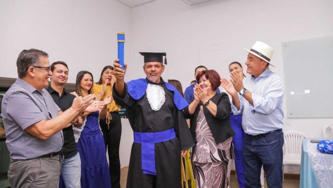 A beca, foi a melhor roupa que Gilson Kennedy Rosário Pereira vestiu em seus 56 anos de vida. Não porque lhe deixou elegante, mas com finesa. Para ele, a vestimenta representa mais que a beleza. É o símbolo da esperança e dignidade. O chinelo de dedo para o Gilson é a melhor combinação. Na manhã desta quinta-feira, o Gilson selou a superação de uma fase da vida com o diploma do ensino fundamental que foi entregue à ele em uma solenidade de formatura exclusiva, pelas mãos do próprio prefeito.