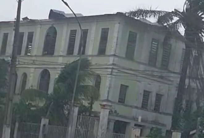 Nas redes sociais, circulam vídeos que mostram a intensidade do vento durante a chuva em Sena Madureira, é possível ver parte do telhado do Instituto Santa Juliana sendo arrancado pela força das rajadas. Foto: captada