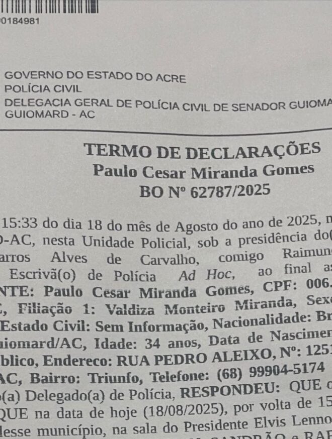 O vereador Paulo Miranda (União Brasil), primeiro-secretário da Câmara Municipal de Senador Guiomard e líder da oposição, registrou Boletim de Ocorrência na tarde desta segunda-feira (18) contra o colega parlamentar Sandro Cunha, o Sandrão (PP), por agressão física dentro da sala da presidência do legislativo municipal.