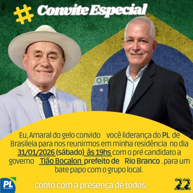Como parte da agenda política, Tião Bocalom estará em Brasiléia neste sábado, dia 31, onde participará de uma reunião com lideranças e filiados do Partido Liberal. O encontro será realizado na residência do vice-prefeito Amaral do Gelo, a partir das 19h.