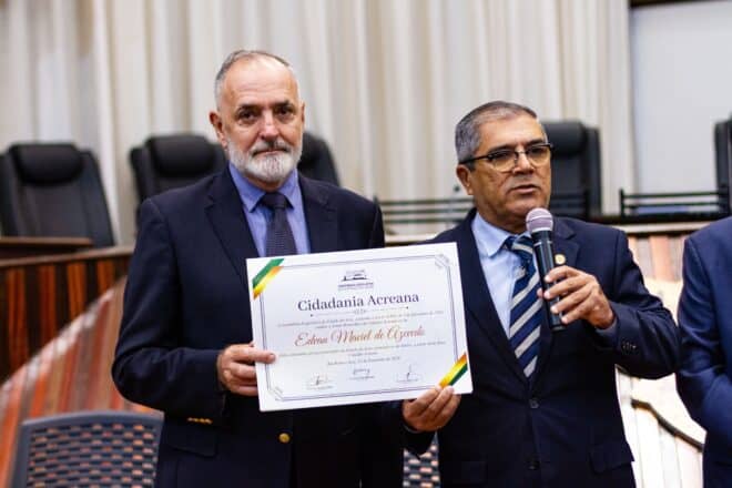 Na manhã desta quinta-feira (03), a Assembleia Legislativa do Acre (Aleac) concedeu o Título de Cidadão Acreano ao médico veterinário Edivan Maciel, em reconhecimento aos seus 37 anos de dedicação ao Estado, especialmente nas áreas da agricultura e veterinária. A honraria foi entregue pelo secretário de Agricultura, José Luis Tchê, que destacou a importância do homenageado para o desenvolvimento do setor.