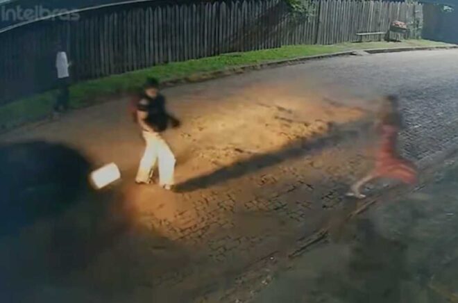 A mulher que estava de vestido e o homem, ao perceberem o carro, ainda tiveram tempo de correr. O carro avançou no cruzamento indo de encontro a mulher. Com o impacto, foi jogada para cima e caiu na rua.