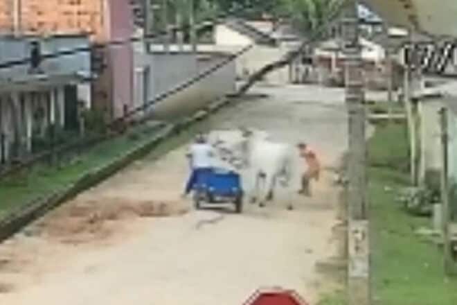 Um homem ainda não identificado foi atacado por um boi em plena rua no município de Feijó. O vídeo, que se espalhou rapidamente pelas redes sociais, mostra um homem vindo em uma motocicleta adaptada com uma carrocinha de entrega passando ao lado de dois bois “trelados” em uma rua no Bairro da Cohab.