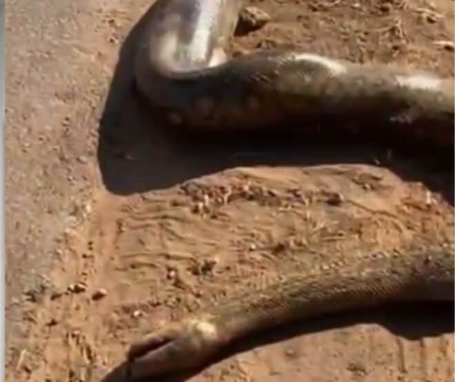 Um vídeo que circula nas redes sociais mostra uma cobra sucuri de grande porte morta por cachorras em frente à rodoviária de Porto Velho, no centro da cidade.