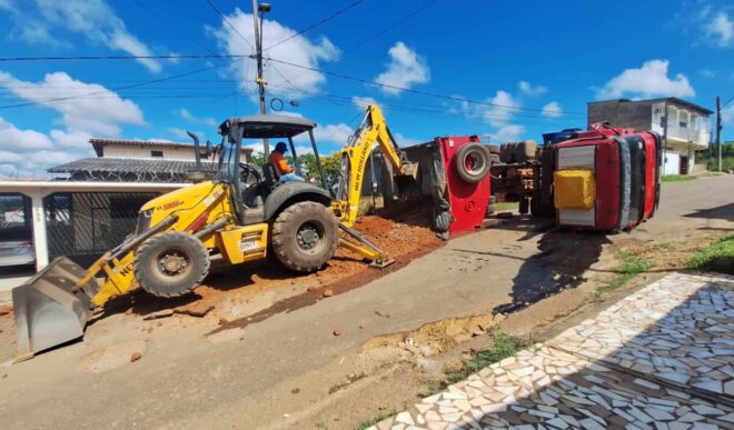 Na manhã desta quinta-feira, 23, um caminhão caçamba modelo Iveco, de placas NAB 0908 e cor vermelha, tombou ao tentar despejar uma carga de barro em um terreno no Bairro José Moreira, na parte alta de Brasiléia, cidade localizada na fronteira do Acre. O incidente ocorreu durante trabalhos de aterramento para a preparação de uma obra no local, onde o terreno inclinado exige nivelamento.