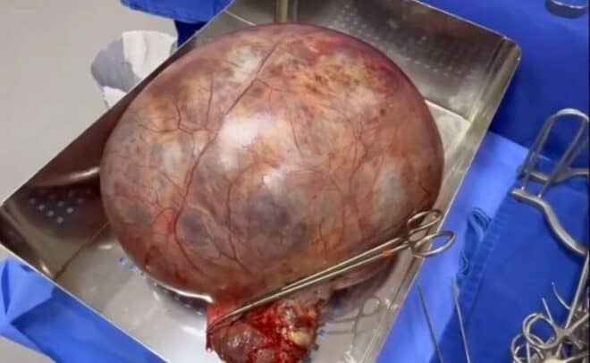Um cisto de quase 8kg foi retirado do ovário de uma paciente pelo médico cirurgião José Ricarte, no Acre, que compartilhou trechos da cirurgia em seu perfil no Instagram.