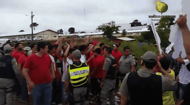Apesar do super esquema policial, apenas uns poucos tentaram evitar o pior na BR. A presença dos opositores que portavam o ‘pixuleco’ distribuíam cartazes contra o ex-presidente, terminou em agressão gratuita e quase estragou o evento.