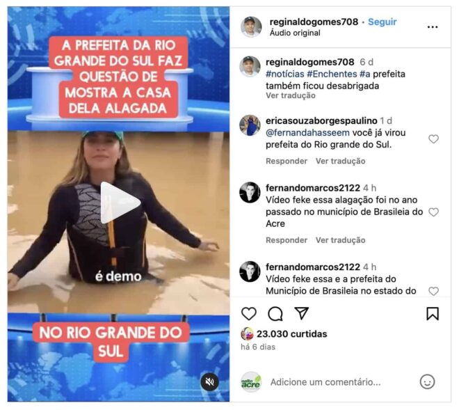 Um perfil usado no Instagram, divulgou um vídeo onde aparece a atual prefeita do município de Brasiléia, localizado na fronteira do estado do Acre com a Bolívia, como se fosse uma das cidades do Rio Grande do Sul, que recentemente foi atingido por uma grande catástrofe natural. Até este domingo (dia 12), foram contabilizados 143 mortos e 125 desaparecidos, além dos prejuízos que ainda estão sendo calculados.