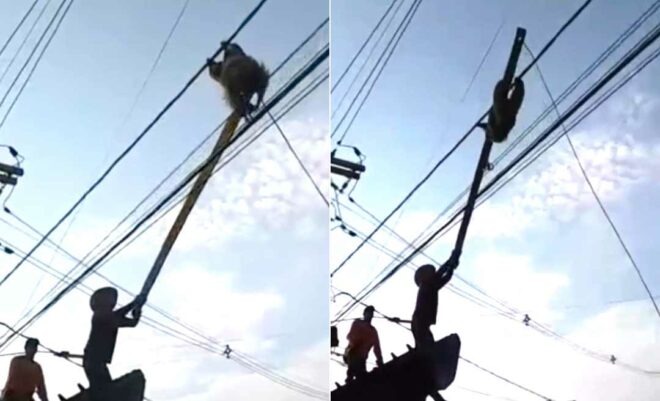 Durante o resgate, os munícipes utilizaram um pedaço de madeira para impedir o choque elétrico das linhas do poste de energia enquanto retiravam o animal.