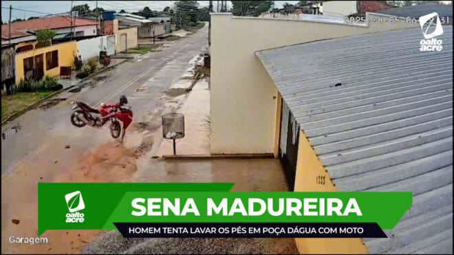 Um motociclista protagonizou uma cena inusitada no início da tarde desta terça-feira (5), no município de Sena Madureira, interior do Acre. Ao tentar lavar os pés em uma poça de água enquanto pilotava, o condutor perdeu o controle da motocicleta e sofreu uma queda violenta.