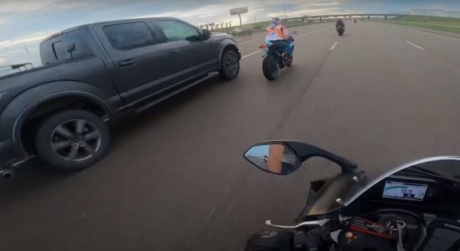 Um vídeo registrado por uma câmera de capacete registrou o momento em que o motorista de uma picape Ford F-150 colidiu contra um motociclista em uma estrada dos Estados Unidos.